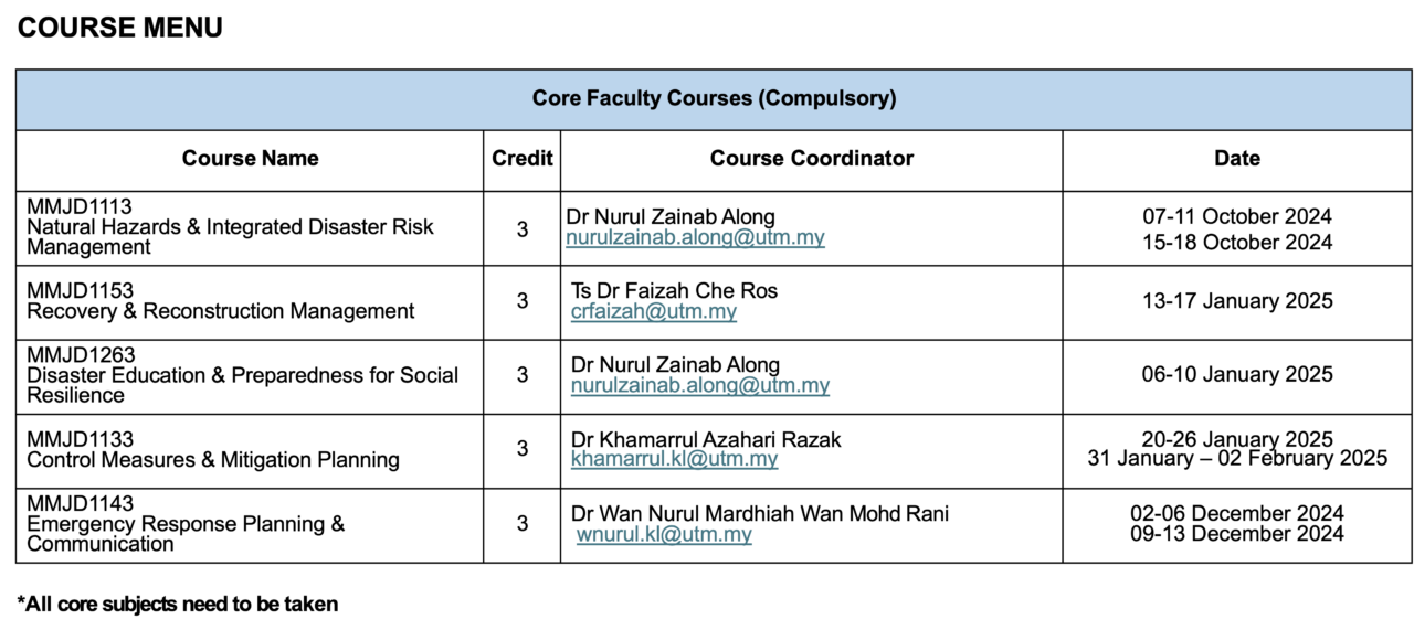 المقررات الأساسية مثل “Research Methodology”, “Integrated Disaster Management”, “Disaster Data Management & Forecasting”, “Control Measures & Mitigation Planning”, “Emergency Response Planning & Communication”, “Recovery & Reconstruction Management”